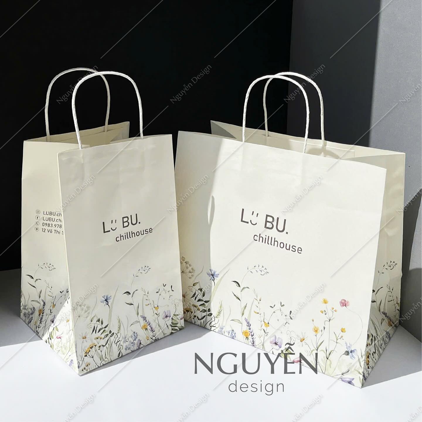 Túi giấy kraft trắng, in hoạ tiết, quai giấy xoắng trắng, quai giấy trắng