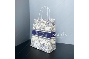 Túi giấy kraft trắng, in hoạ tiết, quai giấy xoắng trắng, quai giấy trắng