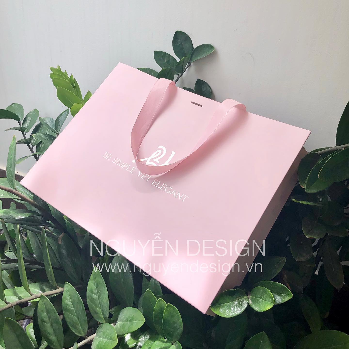 Túi giấy Ivory 250gsm, ép kim logo, ruy băng bóng dán giấu quai